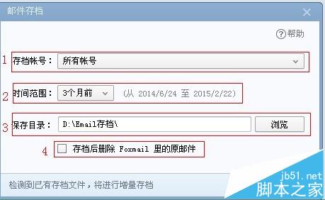 4、在图片中1处可以选择需要存档邮件的账号,可以为所有账号或者已登录的账号;在图片2处可以选择需要存档的邮件的时间范围,如默认为三个月,即存档的邮件为距当前时间三个月以前的所有邮件;也可以自定义存档的邮件时间,在图片3处可以选择存档的邮件位置,记得在图片4处勾选删除foxmail里的原邮件,否则邮箱里的可用存储容量不会增加。