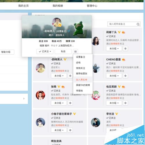 在关注管理界面,首先将鼠标移动到想要取消关注的用户的ID上,会弹出 已关注 私信 和 更多操作 的选项,移动鼠标到更多操作上,会弹出 加入黑名单 屏蔽 和 举报 等,点击加入黑名单即可。