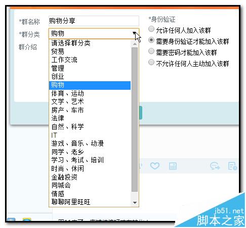 2)在“群分类”右侧的输入框中点下小三角,弹出的菜单中点选此群所属分类;小编在这里点选“购物”分类;