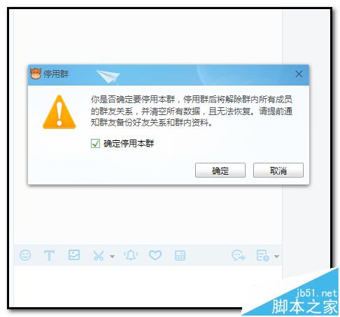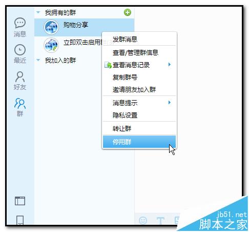 6、若想要停用此群,鼠标右键在此群图标上点下,弹出的菜单中点击“停用群”;弹出的系统对话框中再点击“确定”即可。