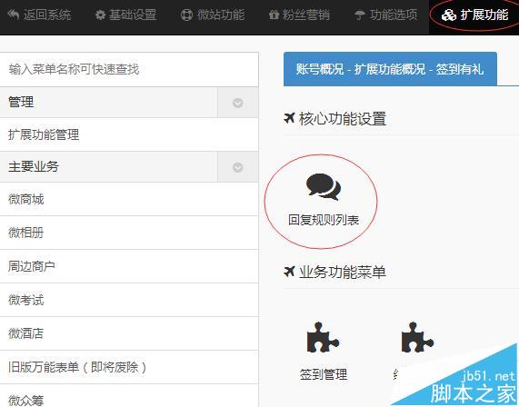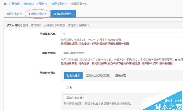 1、在【扩展功能】中找到【签到有礼】点击【回复规则列表】添加【签到有礼】