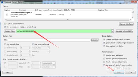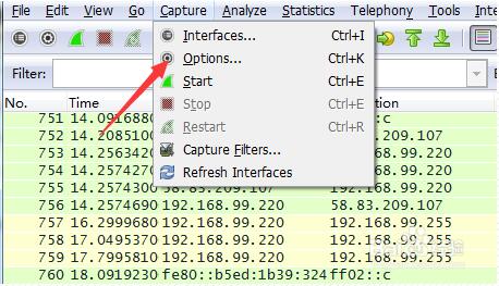 4.进入到了wireshark的option的选项窗口的界面中,之后进行再capture filter的输入框中,src host 192.168.99.220