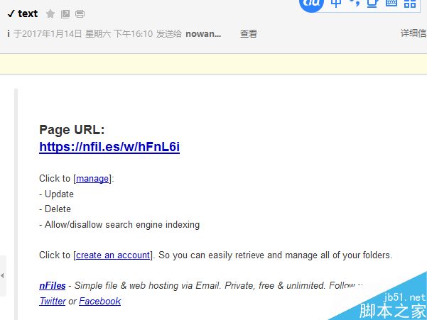 最后点击“发送”按钮,就可以发送到指定的云服务器里面。稍等片刻,服务器就会返回一个电子邮件到邮箱里。在电子邮件里面就会随机产生一个网页链接和管理页面,开启这个网页链接后我们就可以从云服务器里面下载分享的文件信息。如果是PDF或者文本文件(含Word),还可以直接在线上对这些文件的内容进行预览操作的哦。