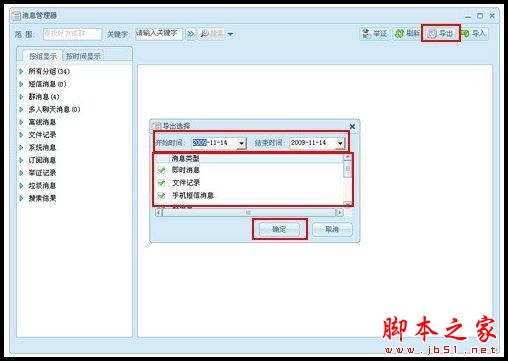 点击右上方的“导出”按钮。在弹出的窗口中选择聊天记录时间和信息类型,点击“确定”按钮: