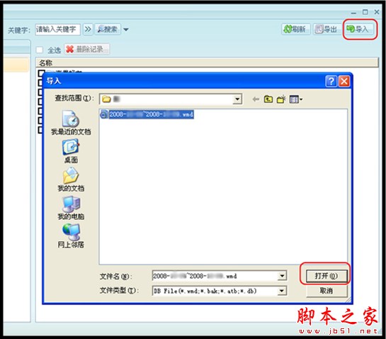 2、在“消息管理器”中点“导入”按钮,在弹出的窗口中找到并选择先前导出的聊天纪录,点击“打开”按钮:
