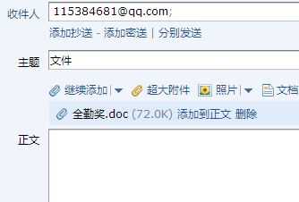 输入收信人,这里填自己的就可以。主题,填文件。单击下方的添加附件按钮,添加附件。
