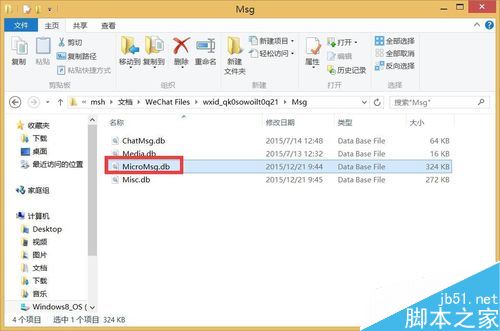 关于聊天记录,在“Msg”文件夹中,存在一个保存微信聊天记录的数据库文件——“MicroMsg.db”文件。如图所示: