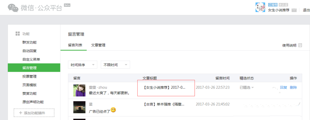 1、打开微信公众号后台页面,在功能管理中找到“留言管理”