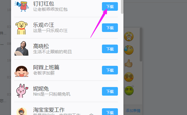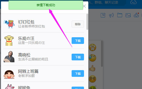 7、选择自己喜欢的表情,点击【下载】。提示下载成功则表示添加表情成功了。