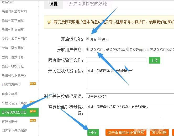 2、点击功能管理进到制作后台,在左边位置的基础设置里面点击--->自动获取粉丝信息,勾选获取粉丝昵称头像等所有信息,然后选择开启该功能,点击下面的保存。