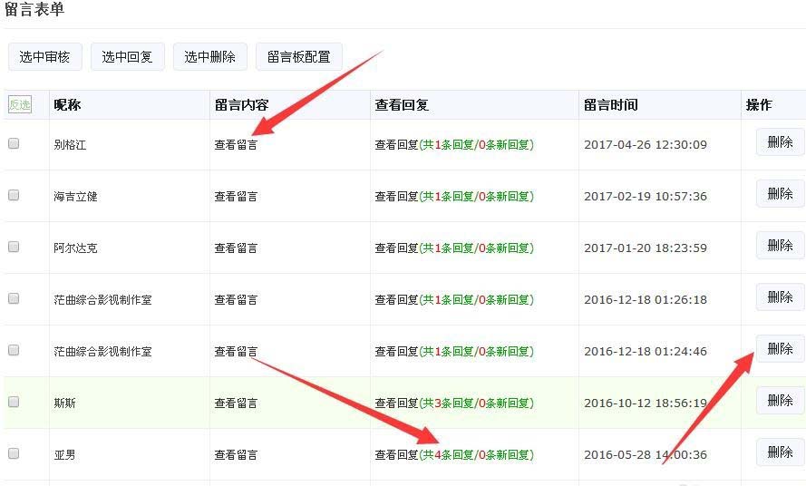 5、商家在制作后台可以点击查看留言字样,查看粉丝填写的内容;也可以点击查看回复,对该粉丝进行内容回复。如果要删除某个留言内容,在结尾点击删除就可以了。如果要设置粉丝关注公众号后,直接弹出留言板,可以在基础设置--关注回复与帮助里面设置,方法是选择其他时段,在下面打上勾,从功能库选择留言板或者是直接填写留言两个字,保存。