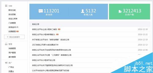 第三步,登陆微信公众号后默认进入的是微信公众号的首页,在左侧【功能】下选择【群发功能】。