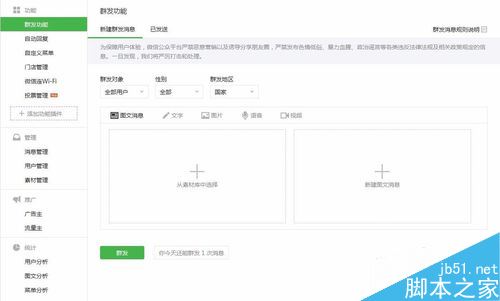 第四步,点击【群发功能】后,进入到群发功能页面,默认进入的是【新建群发消息】群发图文消息窗口。