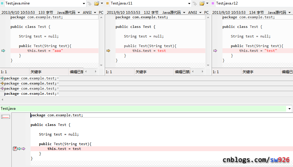 如果使用beyond compare的3路合并工具的话,代码更加的直观