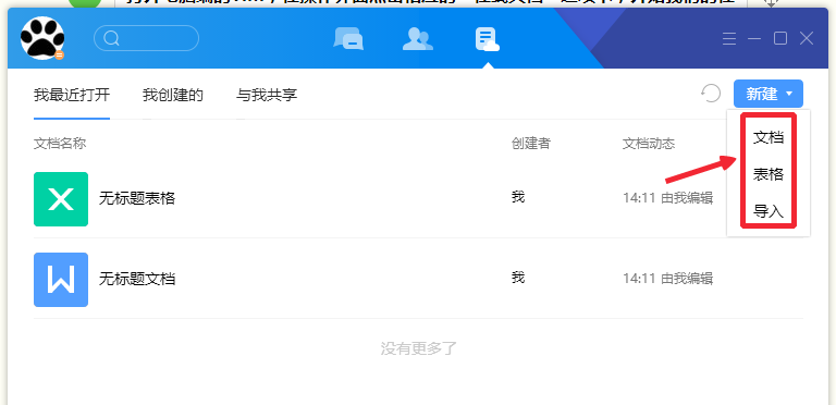 2、点击新建选项,会弹出一个小窗口,在小窗口中有很多可以操作的选项,文档和表格的意义是我们可以直接创建新的文档或者表格,而导入的意义是导入本地的文档或者表格。