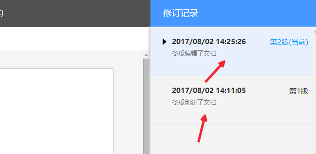 6、即使是用一个成员,在不同的时间段编辑,也是可以都保存下来的,我们把鼠标放在某一次修改记录上,就可以看到那时文档的状态,当然也就可以以那个时候,作为文档编辑的起点。