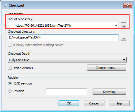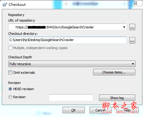 填写资源库URL,以及本地代码文件夹名称。可以选择全部检出,或者根据特定的版本号检出。