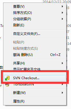 注意:只有安装TortoiseSVN客户端工具后,在相应的检出目录中,才会出现该右键菜单。