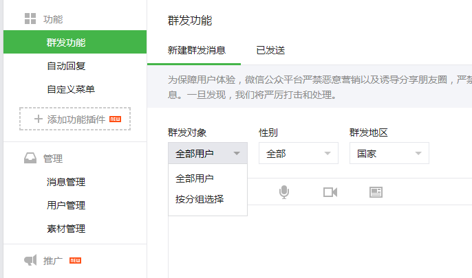 4、在左侧选【发功能】,发送对象里,【全部用户】改为【按分组选择】