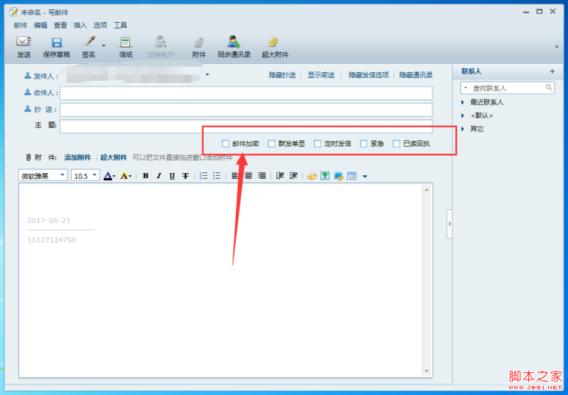 3、在写信界面的“主题”下边就可以看到“邮件加密”的功能了,除了“邮件加密”还有一些其他实用的功能,这里就不多做介绍了;