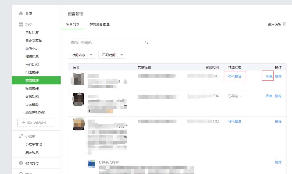 3、在进入公众号首页后,点击“留言管理”。