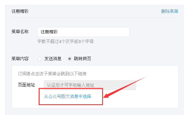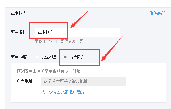 3、进入自定义菜单中的“菜单编辑”中,如下图所示,在菜单名称中填写你的历史记录的名称,比如我设置成了“往期精彩”,在菜单内容中选择“跳转网页”选项。