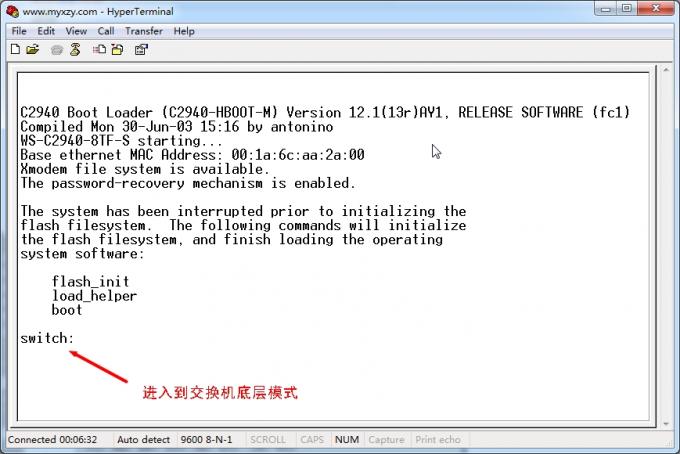 2、交换机接上电,上电过程中,按住交换机正面"mode"按钮,直到sys灯不闪动为止(即:常亮状态)松开"mode"按钮(也可以关注超级终端界面显示字符了就可以松开"mode"按钮),进入到交换机的底层模式switch: