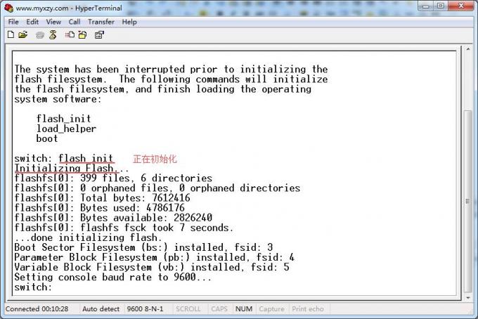 3、输入命令switch: flash_init 回车,初始化flash文件系统(该模式下,不支持命令的缩写,一定要把命令写全。)