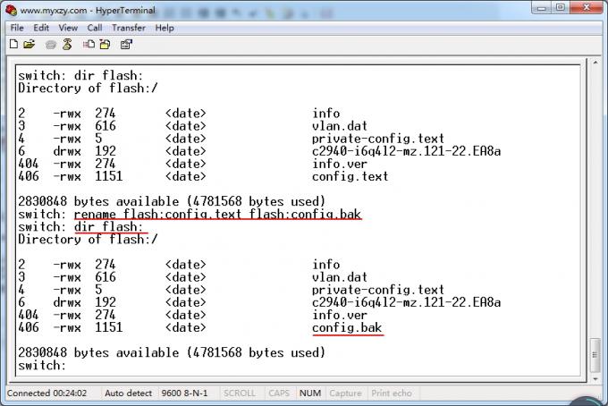 5、输入命令switch: rename flash:config.text flash:config.bak回车,重命名交换机原始配置文件为config.bak,并使用命令switch: dir flash:查看文件名是否修改成功