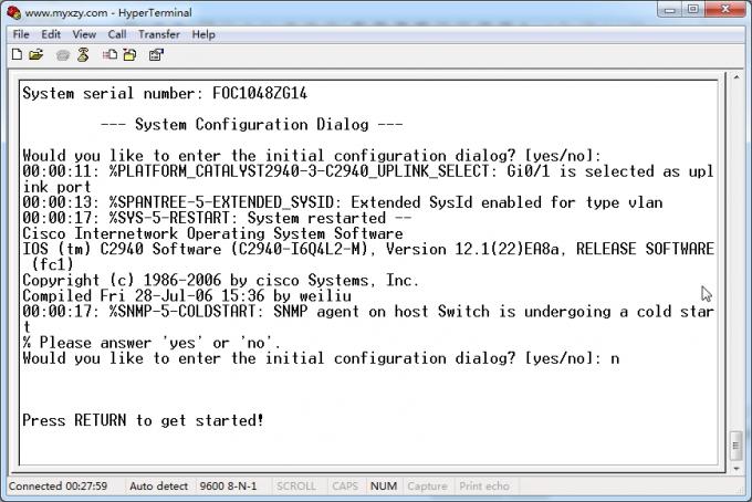1、电脑COM口(没有的使用USB转COM转接头)通过console线连接到交换机console口,并打开超级终端调试窗口。