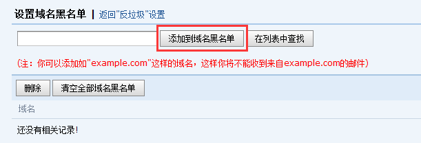 4、还可以点击"设置域名黑名单",可以针对域名地址来添加黑名单,这样可以屏蔽某一域名下的所有邮件地址,添加方式和上面邮件地址黑名单一样