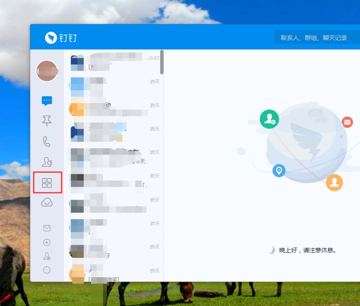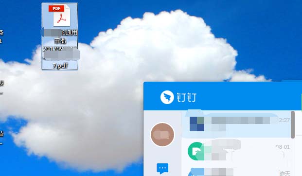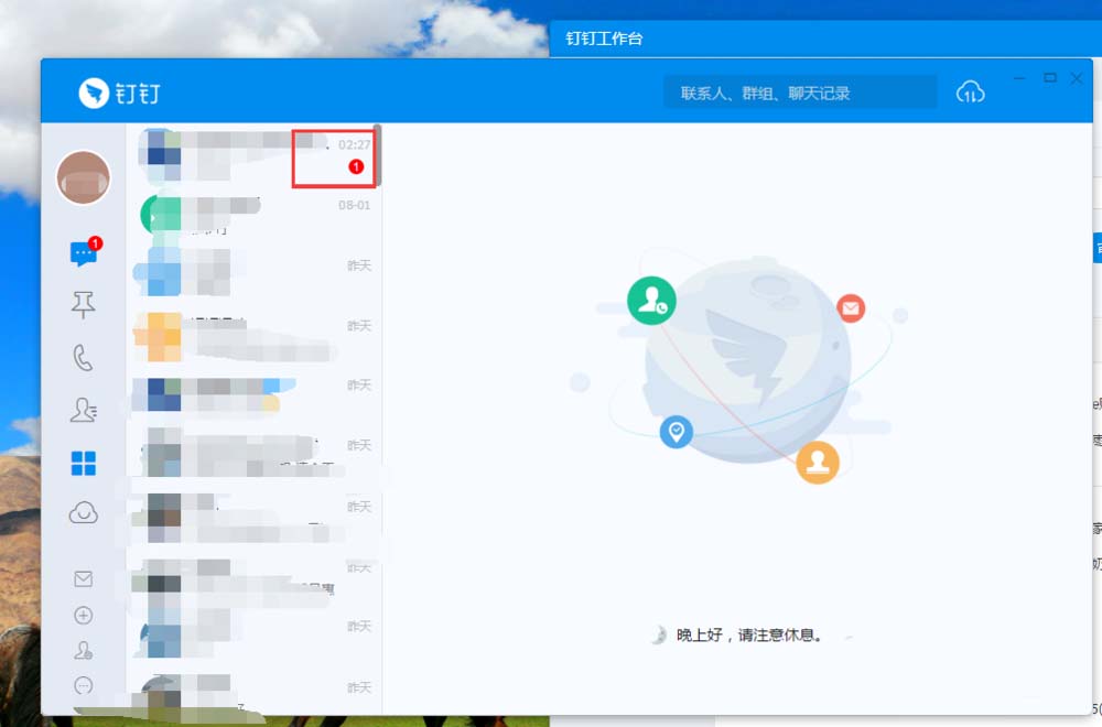 8、关闭钉钉工作台,或者把工作台最小化,在此回到钉钉主页面上,可以看到刚刚点击打印后的那个文件已经发送过来了,显示个红色的1.点击那里。