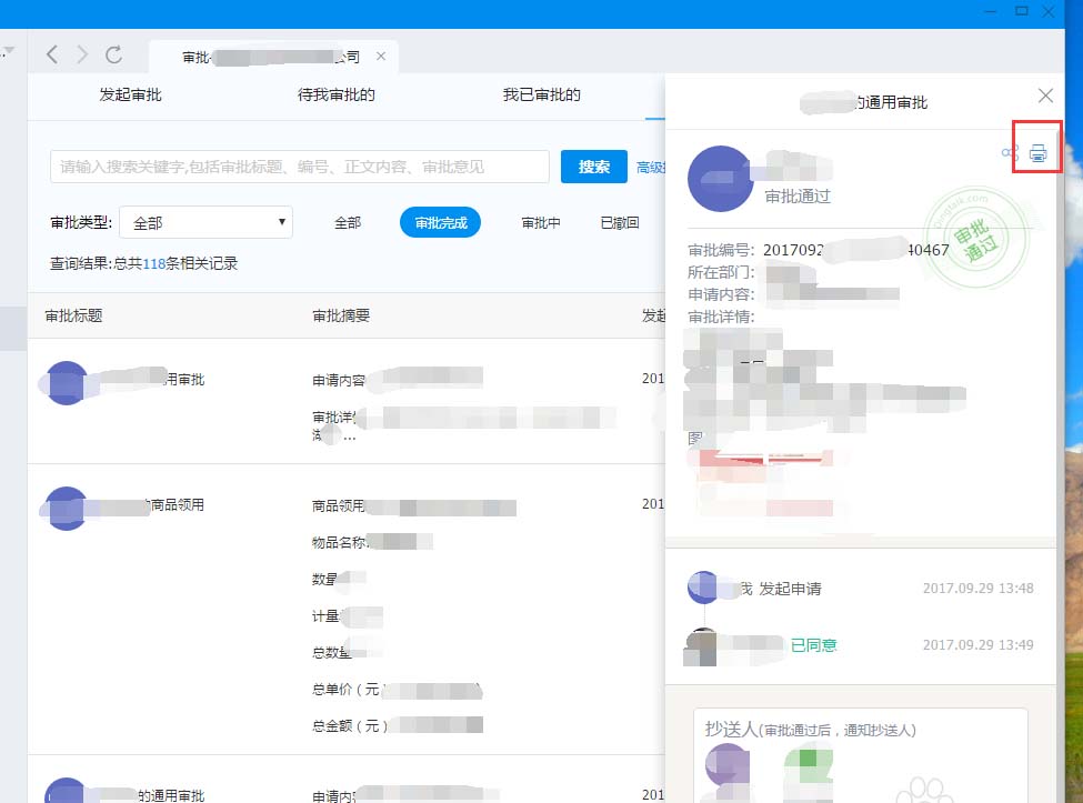 6、打开想打印的那个审批,点击右上角有个打印机按钮。