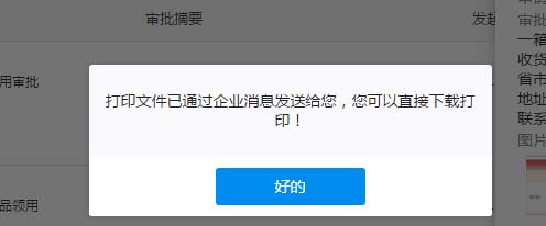 7、此时提示打印文件已通过企业消息发送给您,点击“好的”。