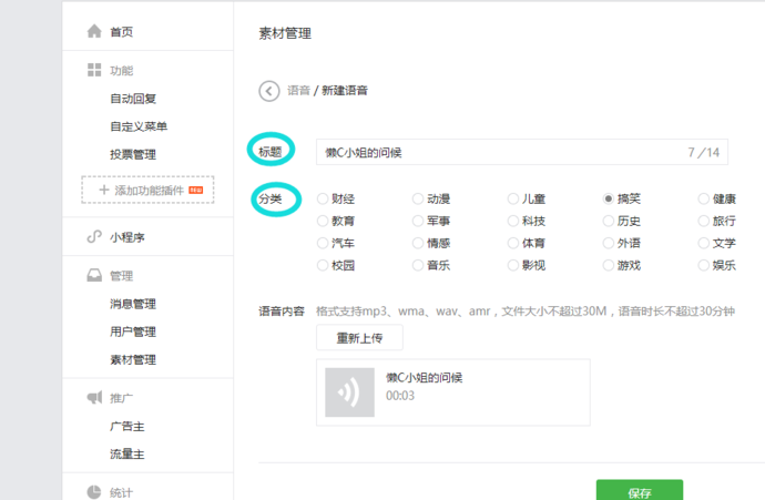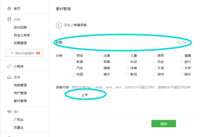 5、然后分别一次填入标题,分类,上传音频,然后保存