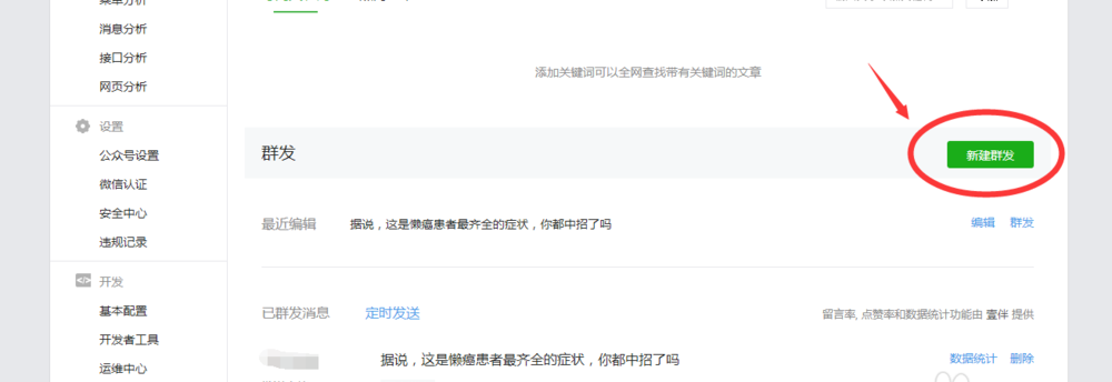 6、然后回到微信公众号首页,下拉微信公众号首页页面,找到“新建群发”标识,点击新建;