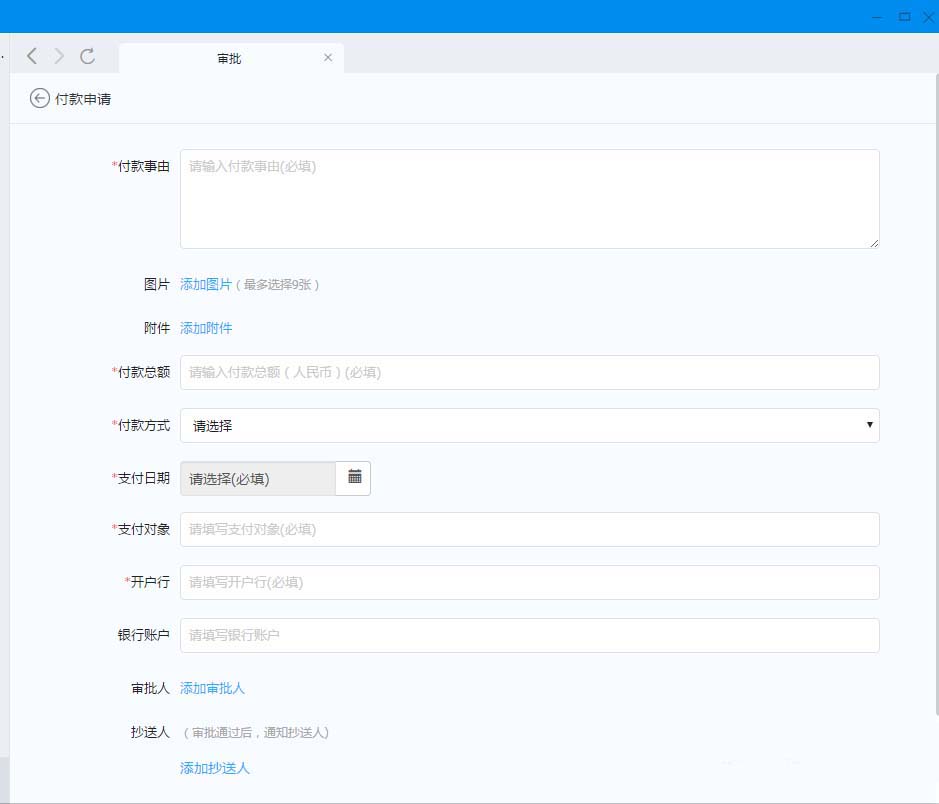 5、在付款申请详情里面,按要求填写内容并上传需要的发票等内容,之后点击添加审批人和抄送人。