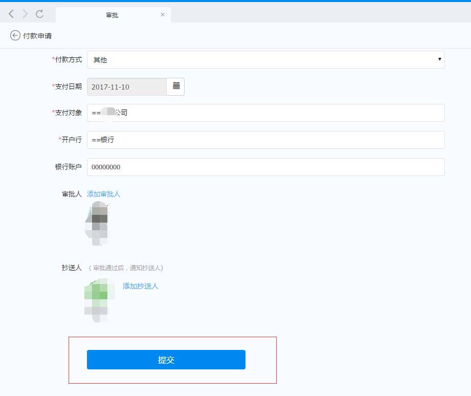 6、全部信息填写完成后,点击提交等待审批即可,审批完成自动抄送给财务相关人员,把需要的合同,发票等内容纸质版提交给财务付款人员即可。
