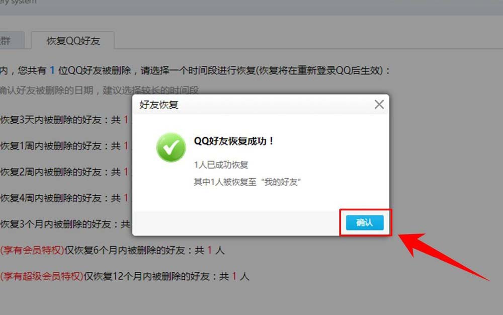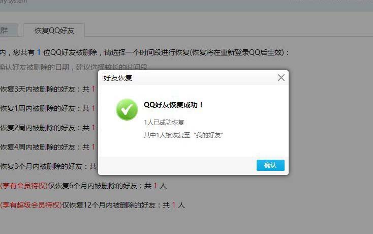 5、点击申请恢复后,页面就会弹出一个“QQ好友恢复成功”的信息提示页面,你登录你自己的TIM账号就可以发现加入黑名单中的好友又重新回来了。