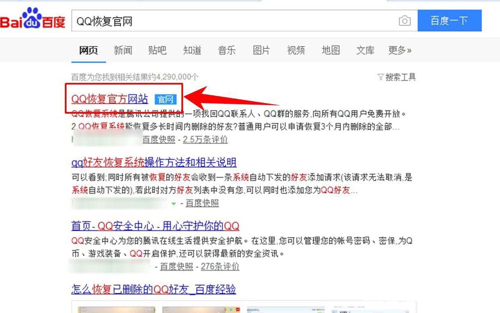 1、首先,在百度搜索引擎中输入“QQ恢复官网”,在搜索结果中点击进入QQ恢复官方网站。
