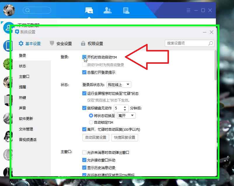 5、用户在"系统设置"中左键单击,勾出:开机自动启动TIM。