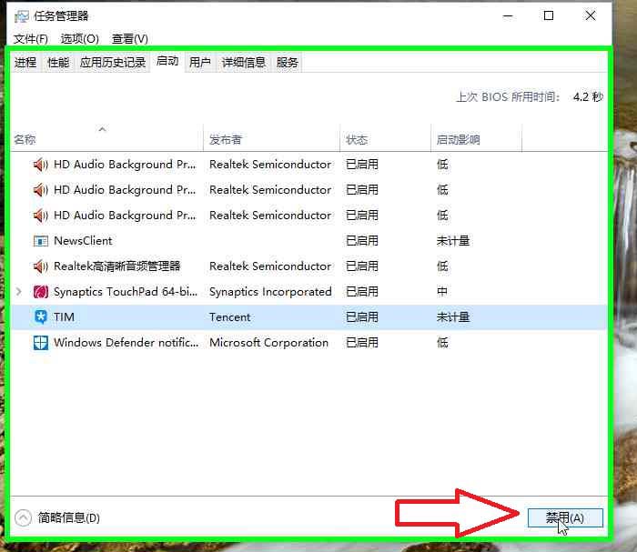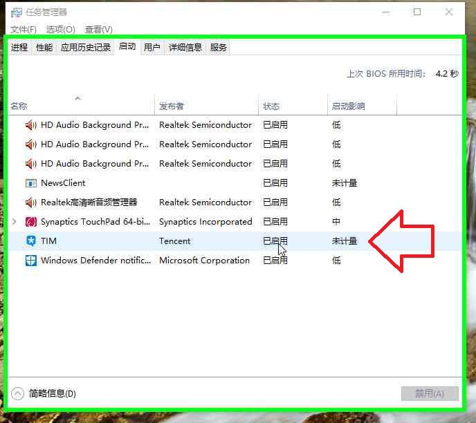 4、用户在"禁用(A) (按钮)"上左键单击(在"任务管理器"中),禁用TIM开机启动。
