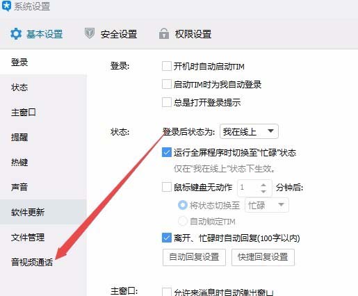 3、这时会打开TIM系统的系统设置窗口,点击窗口左侧边栏的“音视频通话”菜单项。