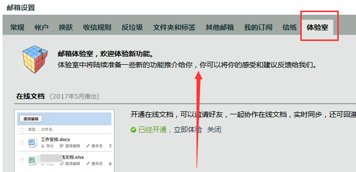 2、在邮箱设置界面,选择“体验室”选项,打开后向上滑动页面,找到“简历”功能,进行开通。
