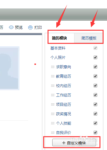 6、如果想完全新建简历,可以先用页面右侧按钮,设计好简历模块及模版,如果没有所需模块,可以自定义模块。