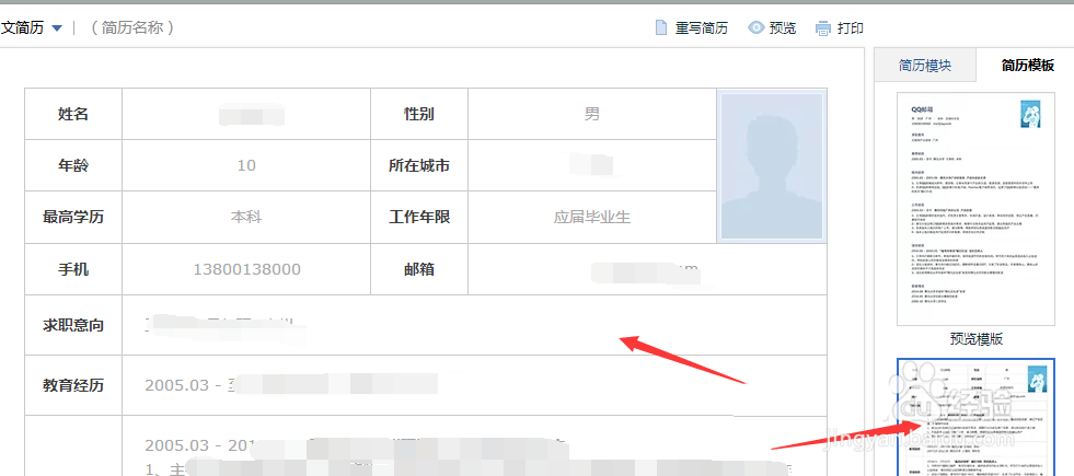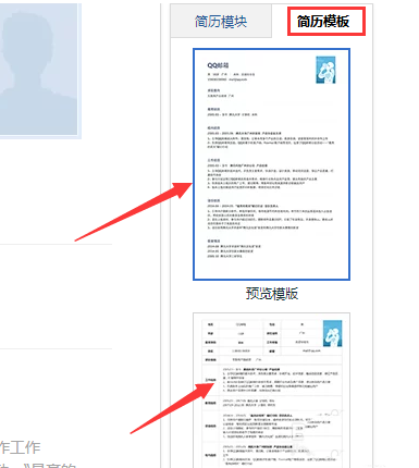 7、简历模块设置好后,点击模版,选择已有模版,模版不能自定义,只能使用系统提供的,点击下方“预览”即可预览相应模版,而点击模版即可应用该模版。