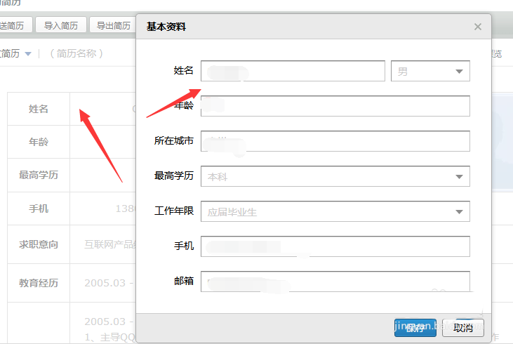 8、点击相应内容,即可弹出资料编辑对话框,在对话框中填写内容即可。最后简历填写完成,可以进行直接邮件发送简历、保存到本地、打印等操作,其中导出格式为doc或pdf。这样如何使用该工具创建简历,介绍完成。