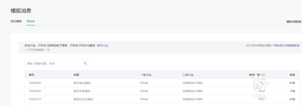2、开通之后我们在模板库里面找到需要的模板,然后添加,并且复制模板编号,如下图所示。