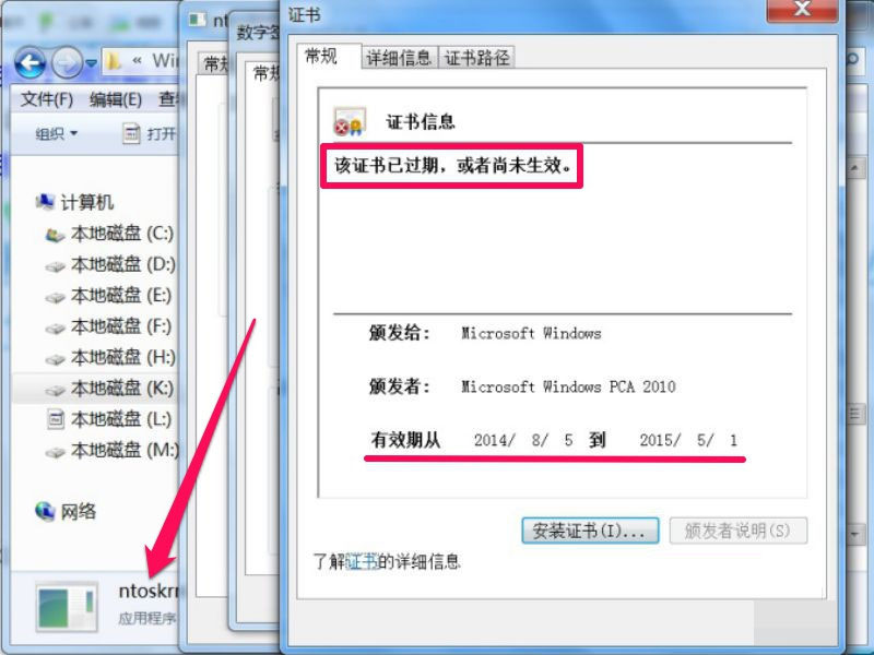 7、再打开ntokrnl文件的属性->数字签名->常规,可以看到有效期改变了,文件也可以正常使用了。