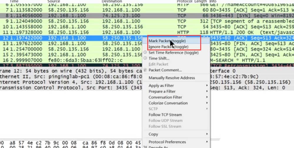 1、打开Wireshark,选择一个协议行,右键单击,选择第一个选项即可进行高亮显示,如下图所示